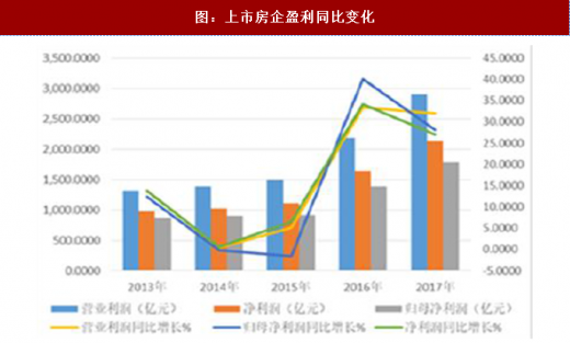 从 17 年年报及 18 年一季报观察,17 年上市房企共实现营业总收入 1.73 万亿,较 16 年上升 6.78%;共实现营业利润 2901 亿,净利润 2134 亿,归属母公司股东净利 1782 亿,同比分别上升 31.93%,上升 28.13%和上升 26.98%。17 年行业整体营收及利润绝对值均再创历史新高。