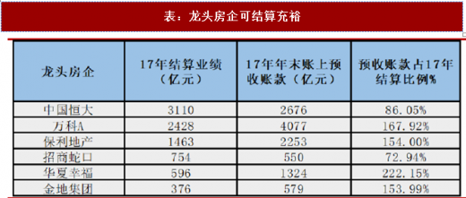 从已售未结来看,大部分龙头房企账上预收账款占 17 年全年结算金额比例超 100%,比例也大多明显高于 16 年年末的水平。行业销售进一步向龙头房企集中,龙头房企业绩持续增长保障性高。