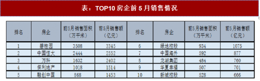 其中前 5 月碧桂园、恒大、万科、保利、融创及绿地集团销售额分别达 3345 亿,2552 亿,2402 亿,1514 亿,1453 亿和 1075 亿,top6 销售均超千亿水平。碧桂园 5 个月销售已超 3000 亿,恒大及万科则超 2000 亿,销售业绩亮丽。在市场调控持续以及信贷环境收缩大背景下,未来销售进一步向龙头房企集中预期较高,市场集中度持续提升,强者愈强趋势将延续。
