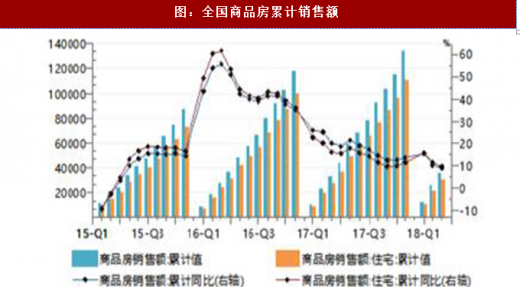 18 年前 4 月全国商品房累计销售面积合计 4.21 亿平方米,其中商品累计销售面积 3.66 亿平方米,同比分别上升 1.3%和上升 0.4%。商品房累计销售量同比增速持续回落,已经降至 2%以下,为 15 年 5 月以来最低的水平。成交额方面,前 4 月全国商品房销售额合计 3.62 万亿,商品住宅销售额合计 3.06 万亿,同比则分别上升 9%和上升 9.5%,涨幅也较前几个月进一步回落,达到单位数增幅。我们认为,当前楼市整体销售增幅持续下降,一方面与持续的调控有关,另一方面也由于银行按揭收缩及利率提升等因素影响。18 年以来部分城市持续出台限价、限签售等政策,抑制楼市成交,因此统计上的销售数据不能完全反应市场需求的变化。当前楼市整体需求端明显转差情况仍没有见到。另一方面季度整体成交绝对值仍创出历史新高(销售增速仍为正);而下半年在调控持续的预判下,统计的销售数据增速持续回落,甚至全年出现负增长可能性加大,但绝对值维持在历史高位水平,整体风险可控预期仍较高。