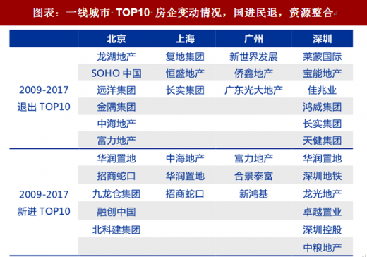 参考观研天下发布《》图表:一线城市 top10 房企变动情况,国进民退,资源整合