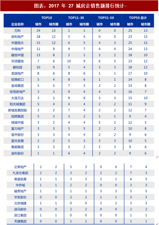 根据我们梳理的2017年27城销售排行统计,从城市布局看企业投资属性可分为三类: