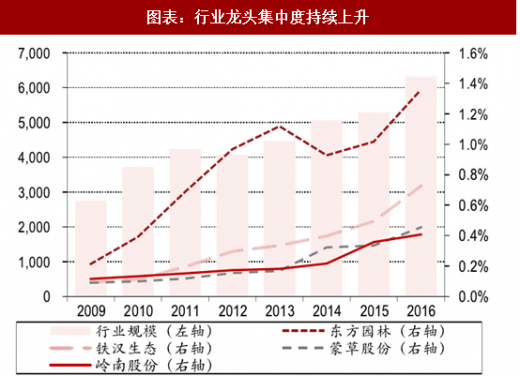 行业壁垒较低,目前正处于行业集中度提升的阶段:行业竞争门槛较低,唯一的壁垒为施工资质,目前行业参与者众多,行业龙头市场份额较低。当前实体经济资金面紧缩,生态园林项目资金需求量大,规模较大的企业有更强的融资能力以及更强的项目承接能力,行业有集中度提升的趋势。