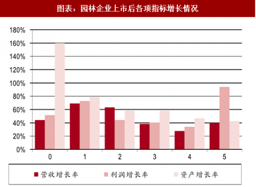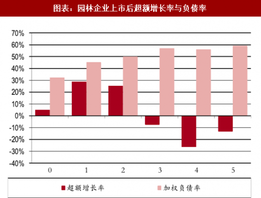 上市后 2-3 年是企业发展黄金时期,后期单项目体量、负债率、现金流制约企业发展:园林行业是重资金行业,上市企业在上市初期负债率较低,上市后融资渠道变多,资金宽裕,现金流边际改善巨大。上市后企业开始融资扩张,并通过“融资-承揽-施工-再融资”的循环承接大体量的项目大幅度改善公司盈利,实现盈利高增,但实际上由于项目的滚动运营企业实际现金流较差。上市后 2-3 年内是企业规模增长的黄金时期。生态园林行业但项目体量一般不超过 10 亿元,高速发展后,单项目体量以及逐步高企的负债率,较差的现金流是制约企业进一步发展的主要原因。
