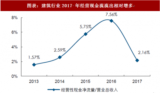 建筑行业2017年经营净现金流量与营业收入的比值为2.16%,同比减少4.40pct。原材料价格上涨使施工企业垫付资金增加,进而导致其经营现金流流出增多。2018 年建筑行业原材料价格略有回落,预计建筑企业经营现金流压力将缓解。