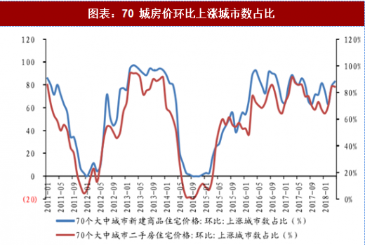 房价上行压力仍在,各地或将继续加码楼市调控。从价格来看,2018 年 1-4 月,70 个大中城市月房价环比上涨城市数相对上一年同期略有减少,但仍维持在 40-70 个之间,4 月份单月房价环比上涨城市数 58 个,达年内新高水平。由此我们发现,2018 年各大中城市的商品房价格上涨存在较大推动力,预计下半年房价仍具上行空间,各地或将继续加码楼市调控措施。