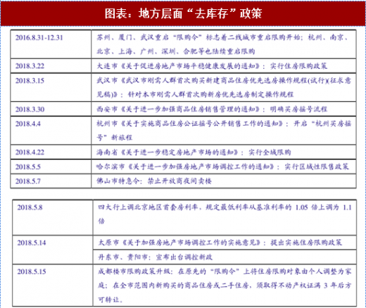 坚持分类调控原则,实行供给侧改革。我们预计,在 2018 年下半年,我国房地产市场“去库存”政策和供给侧调控将继续坚持“因地制宜,因城施策”的原则,一二线热点城市及住房需求高涨、房价过热的三四线城市,将陆续结束“去库存”政策,逐渐收紧保障房货币化、棚改货币化安置等相关政策举措;对于库存量居高不下、住房需求仍有待提高的三四线城市,也将在继续“去库存”、确保刚需的同时,逐步调整“去库存”政策的方向。