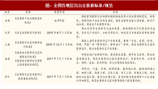 市面上存在“全装修产品质量差、金沙下载送彩金的售后服务差”的疑虑,我们认为伴随各地相继出台有关全装修设计规范/标准有助于打消疑虑,提升消费者接受度。2017年7月1日起,浙江省将正式实施《全装修住宅室内装饰工程质量验收规范》,对全装修如防水、门窗、吊顶、厨房工程、卫浴工程等十三大类进行详细规范,加强对全装修住宅室内装饰装修工程的质量管理。