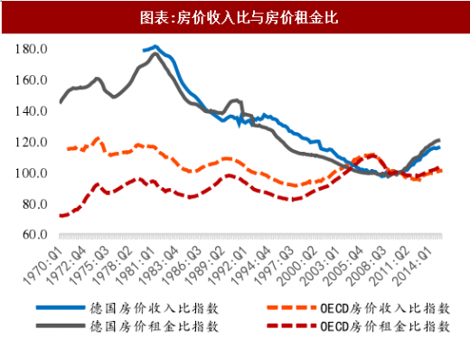 1994-2008年间,德国名义房价保持了长达15年的平稳,到2008年危机前夕,当经合组织(oecd)国家经历了75%的房价涨幅时,德国的名义房价指数甚至比1994年下跌了6%。从绝对水平来看,根据globalpropertyguide的统计和测算,德国房价水平在欧洲各国中处于中游,房租水平则低于多数欧洲国家;从相对水平来看,2015年德国家庭平均住房成本占家庭年均可支配净收入的27.3%,处于一个较为适度的水平。长期平稳的房价和房租,以及快速增长的收入,使得德国居民在居住方面的压力减小,其房价收入比和房价租金比在1980-2008年间以来持续下降。