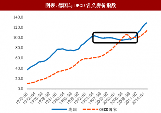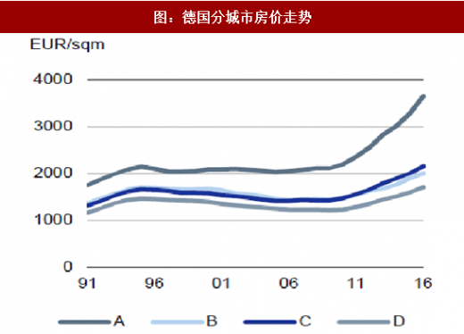 2009年以来,德国住宅价格已连续8年上涨,而且核心城市的房价上涨幅度远高于全国。2009-2016年房价上涨阶段中,总体房价累计上涨了约30%,但核心城市的房价涨幅则达63%,其中慕尼黑的房价涨幅高达约200%。