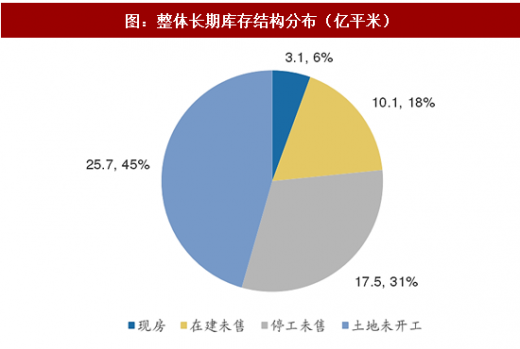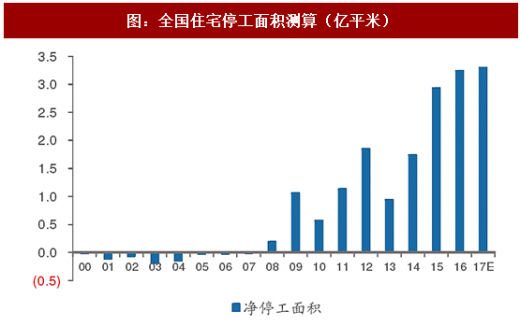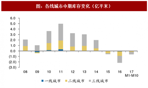 中期库存中包括停工面积(库存)与短期库存,其中停工面积根据有效施工面积推算,截至到17年10月份,当年全国停工项目规模达到3.3亿平米,累计停工面积为17.5亿平米。停工面积的不断增加,除了中小企业的不断退出,与竣工整体增速较低有关,部分三四线城市的房企在开发完成后,由于税费等一些原因没有及时竣工备案,以停工的形式直接交房,这类情况也在停工面积中无法有效扣除。