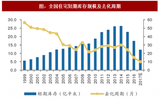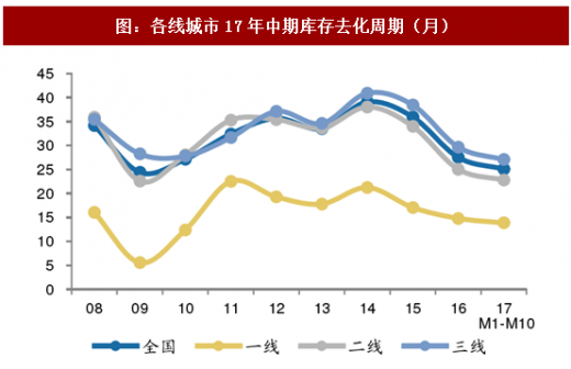 将停工部分从中期库存中扣除,我们可以得到短期库存规模。截止到17年10月,可以转化为销售的短期库存规模13.2亿平米,与年初相比下降4.1亿平米,已经达到了06年的水平。去化周期仅11个月,再创历史新低。