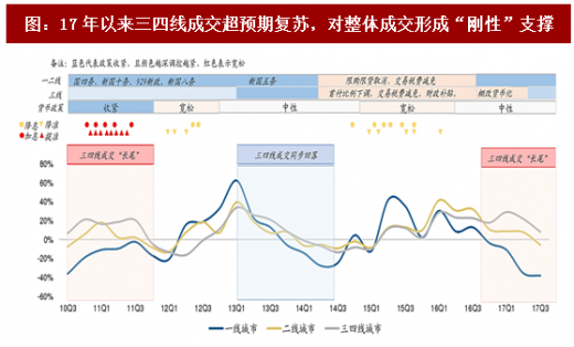 最后,我们需要指出的是,15-16年一二线房价大幅上涨放大了与三线城市的价差观感,由此带动了三四线城市的返乡置业需求。另外,龙头房企加速下沉至三四线城市,消费升级的背景下带动了三四线的改善性需求,这些都是三四线成交持续活跃的推动因素。