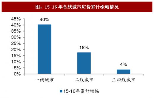 进入16年,伴随着一季度上海、深圳限购限贷升级调控,一线城市成交增速显著收窄,而受益于政策支持、一线城市资金溢出效应等,二线城市成交同比持续快速增长,16年前三季度累计同比上涨34%,而一线仅同比15%。值得注意的是,三四线城市在16年表现也较为显著,前三季度同比大幅增长24%。