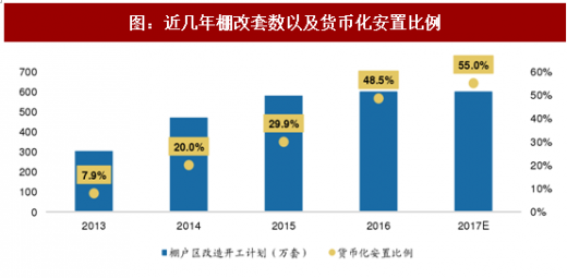 除政策支持外,棚改也是支撑三四线成交持续活跃的主要原因之一。实际上, 15-17年棚改套数并未没有提升,每年都在600万套左右的规模,棚改对三四线成交的拉动主要依靠货币化安置比例的提升。
