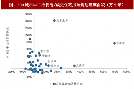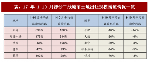 从17年全年宅地供应量价角度来看,库存水平较高的城市在17年整体土地市场的表现是相对比较弱势的,从土地出让到实际成交都有所回落;而低库存城市特别是中西部一些在16年限购政策重启之后市场成交量比较较好的城市,在17年土地市场也配合量价齐升。