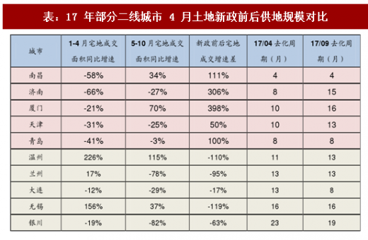 17年4月住建部发文要求各地供地规模与区划周期挂钩,部分城市对政策进行了较好的响应,如去化周期较短的南昌、济南、厦门、天津、青岛等地加大了5月之后加大了土地供应,同时去化周期有所延长,同时去化周期较长的大连、无锡、银川等地5月后减少了土地供应规模,去化周期略有缩短。