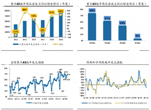 2016年全年来看,成交市场整体高位运行,我们监测的43城市商品房总体成交量较2015年增长23.1%,成交面积创历史新高。但从成交走势来看,成交随着政策面的变化而波动,一季度宽松政策持续落地,刺激需求加快入手,43城市成交月度同比增速逐步攀升,3月单月同比增速扩大至83%,市场景气度达到小周期高点。此后,自3月末开始,以上海、深圳为代表的热点城市逐步出台调控政策,小周期拐点显现,成交热度出现下滑迹象,二、三季度同比增速连续收窄。而进入四季度,十一前后,20余城重启或更新限购限贷政策,并且持续深化调整,需求端的强调控导致成交热度出现显著下滑,43城市商品房成交在11月同比首次出现下滑,并且在12月降幅进一步扩大。展望2017年,我们认为随着调控政策的进一步发酵,需求观望情绪将会进一步加重,未来行业景气度将继续下行,基本面也将步入量价齐跌阶段。