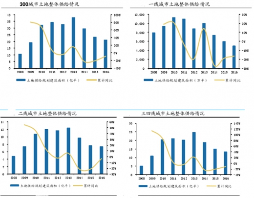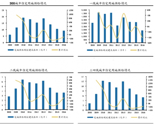 2016年,300城市土地供给建筑面积合计21.25亿平米(累计同比-9%),其中,一线城市4990万平米(累计同比-17%),二线城市7.40亿平米(累计同比-3%),三四线城市13.35亿平米(累计同比-12%)。