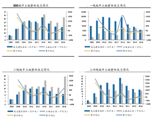 成交方面,2016年,300城市土地成交面积合计17.97亿平米(累计同比-4%),其中,一线城市4258万平米(累计同比-23%),二线城市6.40亿平米(累计同比-2%),三四线城市11.15亿平米(累计同比-4%)。