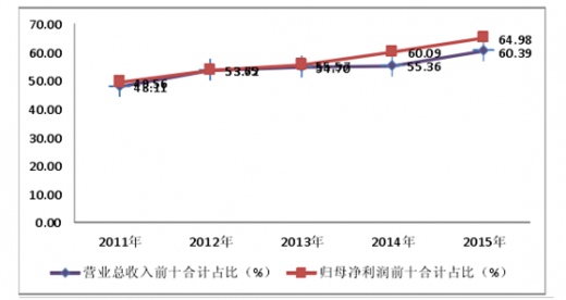 房地产行业营业总收入和归母净利润前十合计由 2011 年 48.11%和 49.56%上涨到2015 年 60.39%和 64.98%,行业整合度不断提高;营业总收入万科 a、华侨城 a 、荣盛地产、保利地产、金地集团 5 年全部位于前十,金融街、中南建设、招商蛇口、首开股份、新城控股 5 年入围 4 次;归母净利润万科 a、华侨城 a 、荣盛地产、保利地产、华夏幸福、金地集团 5 年全部位于前十,金融街、招商蛇口 5 年入围 4 次。房地产行业龙头企业保持强者恒强的局面,并且还在扩大营收占比,着重分析行业前十的营收状态将有助于行业整体分析。