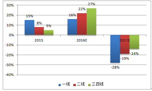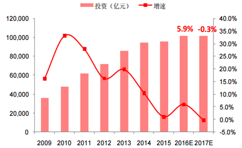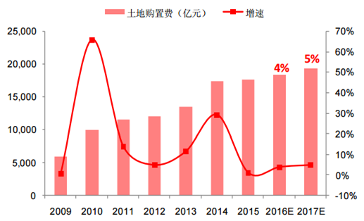 由于土地购置费是分期付款,导致今年的“地王潮”存在滞后效应,预计明年土地购置费将保持正增长,预计 2016、2017 年土地购置费增速分别为 4.0%、5.0%;预计 2017 年销售面积增速为-17.1%,但考虑今年一 季度的高基数,2017 年一季度销售面积降幅应大于全年,预计 2017 年一季度销售增速为-25.0%。结合推算的 2017 年施工面积增速-0.6%,最后得到 2016、2017 年投资增速预测值为 5.9%、-0.3%。