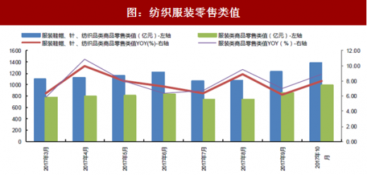 据国家统计局数据,截至10月,我国服装鞋帽、、类商品零售类值为11,882.5亿元,同比增长7.3%,服装类商品零售类值为8,371.0亿元,同比增长7.3%。