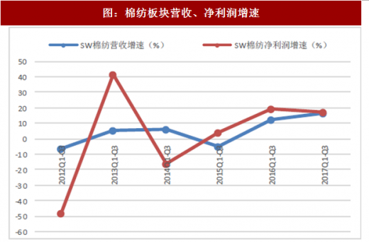 17q1-3,棉纺板块营收增速为13.03%,同比增加0.83pct.;归母净利润增速为16.28%,同比减少2.87pct.;毛利率为18.22%,同比减少0.65pct.;净利率为7.43%,同比微减-0.02pct.。