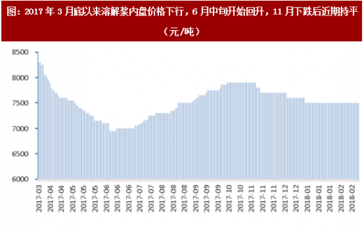 3月2日,溶解浆内盘价格为7500元/吨,持平前一周,较去年同期下跌850元/吨,同比下跌10.18%;年初至今平均价为7500元/吨,同比下跌531元/吨,跌幅为6.61%。