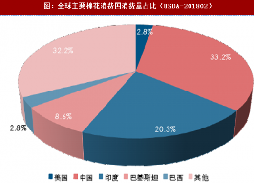 图:全球主要棉花消费国消费量占比(usda-201802)