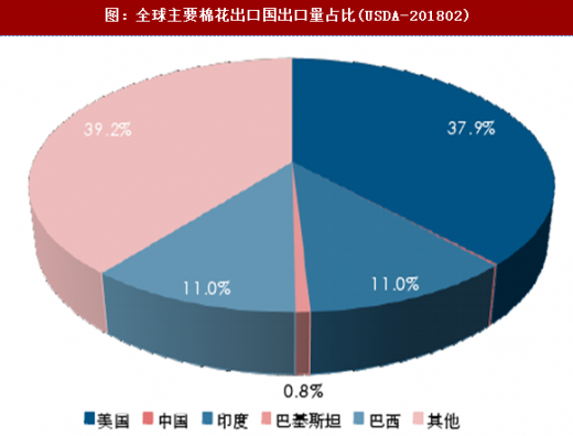图:全球主要棉花出口国出口量占比(usda-201802)