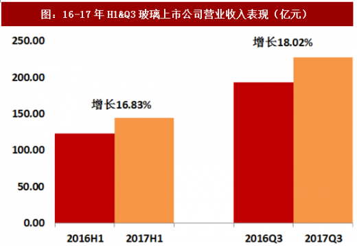 今年玻璃行业整体营业收入水平上升,相比2016年,今年上半年及前三季度分别增加了20.68亿和34.71亿元,归母净利今年上半年及前三季度分别增加了4.21亿和5.79亿元,其中旗滨集团归母净利上半年及前三季度相对2016年分别增加了3.84亿和3.93亿元,是整体净利润提升的主要来源,大部分玻璃上市公司受原片价格上涨,归母净利表现不佳。