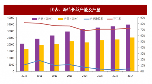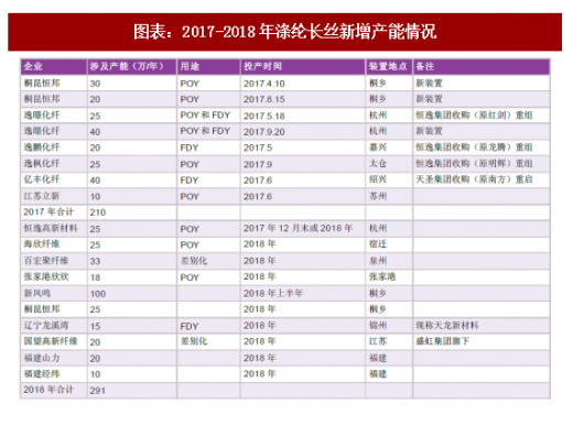 2017年度已经投产的新装置合计产能约90万吨/年,即桐昆恒邦二期50万吨项目以及逸暻化纤二期40万吨项目。而有效产能增加约为210万吨/年,逸鹏(原龙腾)20万吨/年装置5月重启,逸暻(原红剑)25万吨/年装置5月重启,亿丰(原南方)40万吨/年装置6月重启,立新10万吨/年装置6月重启,逸枫(原明辉)25万吨/年装置9月重启。据百川资讯的统计,2018年将有291万吨的长丝装置投产。