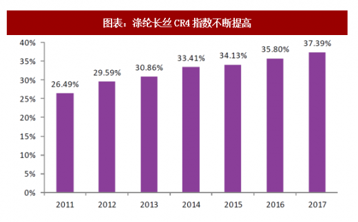 随前几年残酷洗牌过后,多家企业破产,恒逸、荣盛、天圣(亿丰)等行业龙头企业接盘,涤纶长丝市场似乎迎来了“新寡头时代”,目前poy4 2的6家工厂共占有涤丝poy总产能50%以上,而涤丝fdy有30%以上产能掌握在恒逸、恒力、亿丰三家企业中,产能更加集中使得涤丝企业市场话语权加重,对于市场运行的管控能力显著提高。涤纶长丝cr4指数不断提高,已就从2011年的26.49%上升至2017年的37.39%。