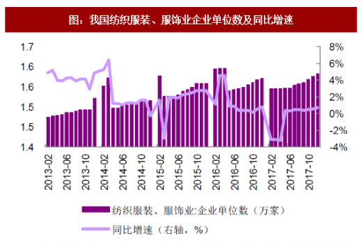 2017年、服饰业企业单位数1.58万家,同比增0.70%,较去年基本持平。