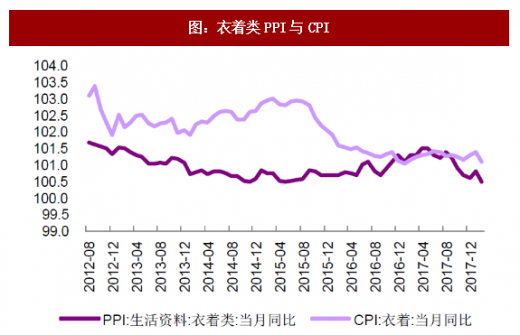 3)国内服装销售平稳较快增长、服装价格温和上涨:2017年以来,国内宏观经济形势稳中向好,中国制造业采购经理指数(pmi)持续在枯荣线以上,市场情况不断好转,需求回暖带动服装消费平稳较快增长。据中国服装协会测算,2017年全国服装销售总额约2.87万亿元,同比增8.3%。