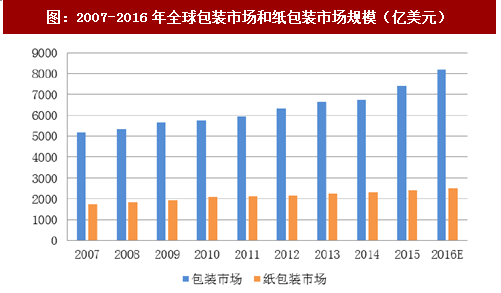 根据全球最大包装研究机构smitherspira的数据,全球包装市场规模自2007年的5,160亿美元以来快速增长,2016年预计可达8,200亿美元,年复合增长率约4.74%。而其中,纸包装产品凭借其价格低廉、绿色环保、加工性能优良的特点将在未来包装行业中占据越来越重要的地位。