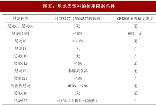 表中列出了gb4806.6与fda《尼龙树脂》中的酒精度限制条件差异。实际上没有厂家会采用尼龙作为白酒包装材料主要用作过滤材料