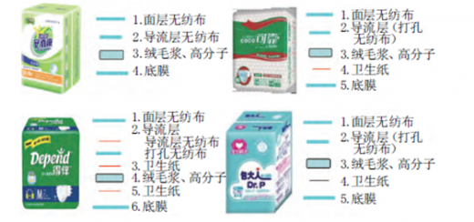 制造纸尿裤的材料通常包括、、高吸收芯层(吸水树脂和绒毛浆)、底膜(pe膜)、橡筋、胶贴(前 左右)、腰围松紧带等。虽然目前市场上的纸尿裤款式玲琅满目,但基本构造大同小异。一般来讲,纸尿裤由上到下可以具体拆分成表面包覆层、导流层、吸收芯层和底层四部分,其中吸收芯层是最重要的组成部分。