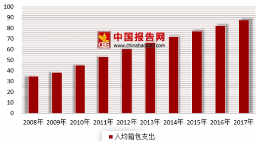 受益于居民收入提升,旅游、户外与商务出行频率增加,我国人均箱包支出额处于快速增长阶段。按照行业规模(剔除手提包/钱包)及人口总数估算,2017年我国人均箱包支出额87.8元。