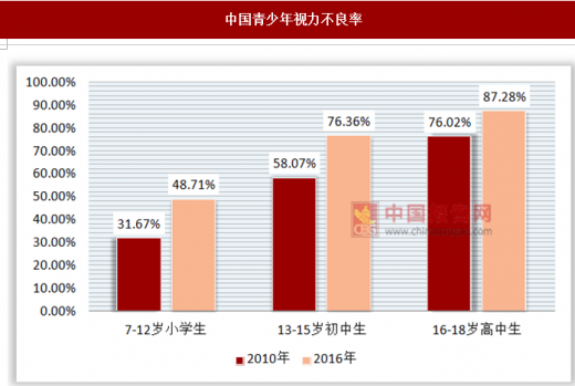 我国是全世界人口数量最多的国家,根据统计,2017年我国约为14.05亿人口,占全球18.82%。但同时,根据《国民视觉健康》研究,2012 年中国 5 岁以上总人口中,近视患者人数在 4.37 亿-4.87 亿之间,我国是视光矫正患病率(近视率)最高的国家,平均每3个人中就有一个人具有视力问题,近视人口在世界平均水平是22%,我国人口近视率是全球平均水平的1.5倍。更为严重的是我国近视人口发生率最高的群体是学生群体,小学、初中和髙中近视率分别达到48.71%、76.36%和87.28%。