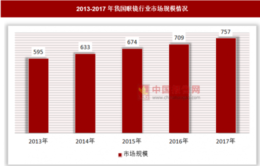 这些因素催生了我国眼镜市场的不断增长,2013年我国眼镜市场规模约为595亿元,到2017年增长到了757亿元。
