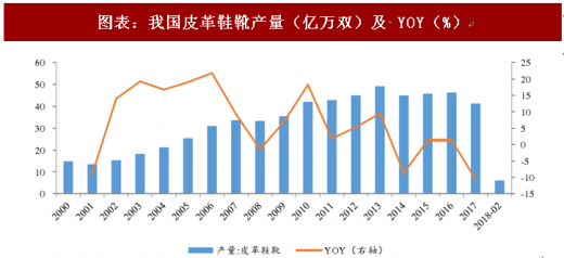 图表:我国皮革鞋靴产量(亿万双)及 yoy(%)
