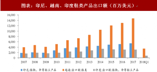 图表:印尼、越南、印度鞋类产品出口额(百万美元)