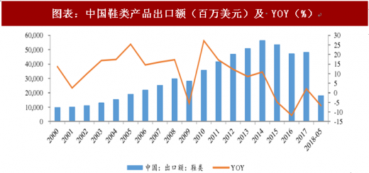 图表:中国鞋类产品出口额(百万美元)及 yoy(%)