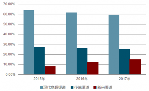 现阶段现代商超渠道是我国卫生巾行业销售的主要渠道。2017年卫生巾现代商超渠道占比59.5%, 传统渠道占比25.5%, 新兴渠道占比15.0%。传统渠道在一、 二线城市及沿海发达地区的市场份额相对较低,在三、 四线城市及农村地区, 传统渠道占据了一定规模的市场。 在卫生巾行业,以为代表的新兴渠道市场逐渐壮大。