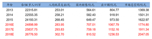 2015年中国0-14岁人口为2.67亿人,年人均玩具消费268元人民币,随着四大因素的影响,新生儿数量将逐年增加,人均玩具消费将所提高,从而提升玩具的国内销售。美国经济的复苏以及人民币的贬值将有望带动出口额保持稳定增长,预计玩具总规模将在2018年达到2000亿元人民币。