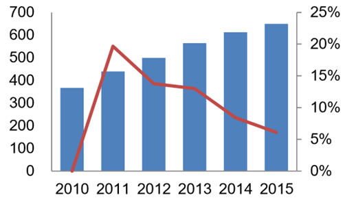 截至2015年数据统计来看,我国合成树脂及共聚物产量达7691万吨,同比增长10.5%。