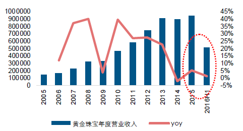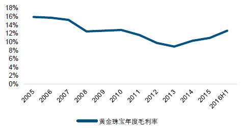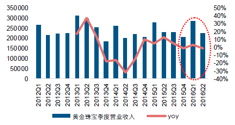 黄金珠宝受高基数等因素影响,收入增速下滑,毛利率迎来低位改善。2016h1 黄金珠宝收入同比增长1.16%,增速同比下降7.61 个百分点。2016q2 黄金珠宝营业收入同比下降1.11%,增速同比下降14.03 个百分点,环比下降4.16 个百分点。黄金珠宝收入下滑主要原因在于一方面2015 年黄金珠宝收入增速较快带来的高基数,另一方面黄金珠宝企业外延并购转型效果尚未显现,收入增长暂时缺乏新的推动力。