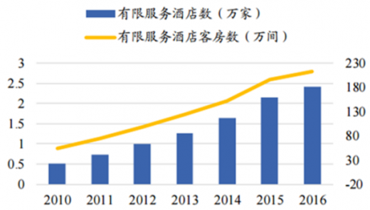 旅游市场火热带动酒店需求,酒店升级助力品牌家纺。家纺产品的另一个主要需求端,就是酒店行业。一方面,酒店消费同旅游消费息息相关。根据国家旅游局的数据统计,2016年全国国内旅游人数44.4亿人次,相比较于2011年的26.41亿人次,年复合增长率约为9%。2017年上半年国内旅游人数25.37亿人次,比上年同期增长13.5%。旅游业的继续兴旺,将会带动酒店业及服务业对家纺用品的需求,进而对家纺行业的增长形成巨大的推动。